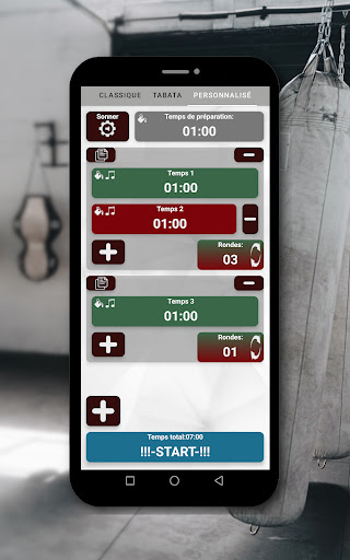 - configurer le temps de préparation, le temps de travail et de repos, les cycles, ainsi que vous pouvez configurer votre propre minuterie personnalisée