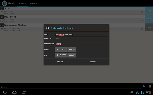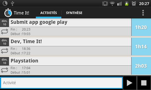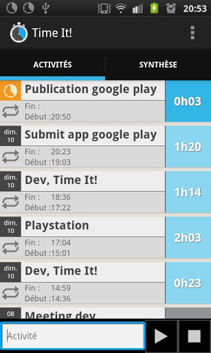 TimeIt! permet l'enregistrement facilité du temps passé sur n'importe quelle activité : travail, sport, trajet, loisir... Tout ceci le plus simplement du monde en utilisant un unique bouton.
