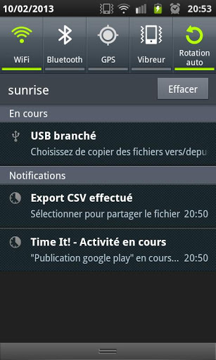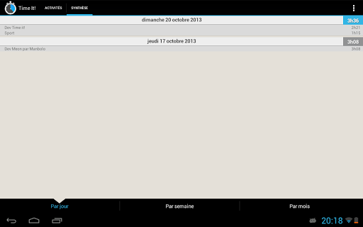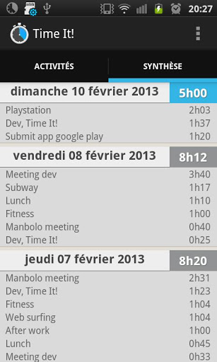 Avec ces 2 modes de visions (en continue ou en synthèse journalière) et son exportation en CSV (compatible OpenOffice, Excel, Calc, Google docs), Time It! donne accès à ceux qui le souhaitent à des statistiques élaborées.