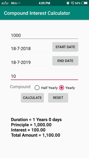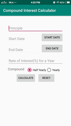 Cette calculatrice a la capacité de calculer l'intérêt composé.L'utilisateur peut entrer le montant principal, la date de début, la date de fin, le taux d'intérêt (%) pour une année et sélectionnez la période composée (annuelle, semestrielle) et appuyez sur le bouton Calculer.La calculatrice calcule et affiche l'intérêt, le montant total (principe + intérêt) et la durée.