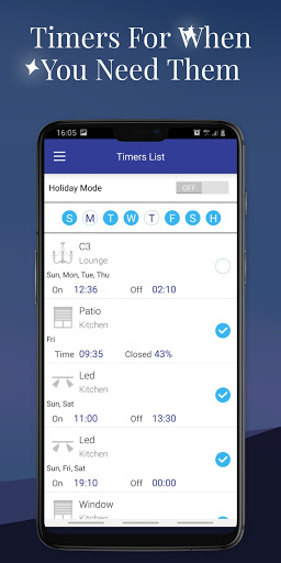 Define lights, dimmers, electric blinds & shutters, water heaters, sockets and more with an easy and simple interface – no programming needed