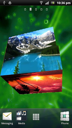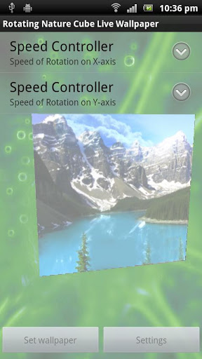 Rotating Nature Cube live Wallpaper.The gyrating nature cube live wallpaper is flickering. This live wallpaper displays six faces of a cube with each face displaying the images with one or other dimensions of nature with the green background fading in and out.Everyone who wants to have something different for personalization of their android screen must try this application at least one. The cube has six faces with each face having image of either , fishes in sea, mountains, landscape,animals,green plants, sunset, beaches and seaside and flowers.The idea is to cover all basic five elements of nature i.e. air,water,earth,fire,sunFeature:1. Six awesome cube faces with matching background.2. Settings for choosing the speed of rotation along xaxis and yaxis.3. It Automatically rotates from different angles.Set this free HD live Wallpaper in your precious android smartphone and feel the essence of greenery and nature in your life. We highly support the go green movement. To set this as wallpaperLong press on home screen gt; wallpapers gt; live wallpapers gt; rotating nature cube live wallpaperAlso, no internet or wifi connection is required for this application. The application has been tested extensively on various models of Samsung galaxy ace, Sony Xperia, HTC One V. The wallpaper is not designed for tablets and Samsung galaxy Note. It is designed for these resolutions: 240320, 320480, 480854, 480800. Now no more siri is required to answer your smple love query , it can be done through this app only. The application requires some special permissions like GPS,etc. but that is only for ad networks and no other reason.If you like it share the romantic look on your important droid smartphone with your friends, family and loved ones at facebook twitter and gmail.Download this amazing and sweet live wallpaper from android market of google for free Tags: nature, green, go green, fish, sea, trees, beaches,animals, plants, wallpaper, live wallpaper, nature theme, cube, rotating cube