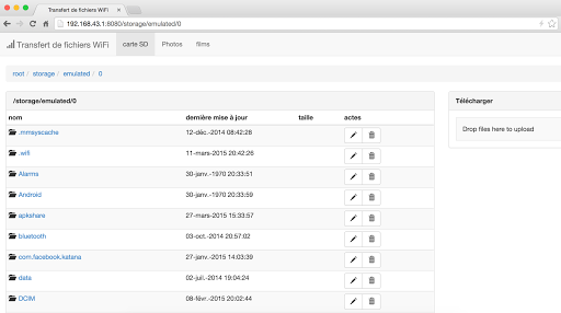 1. fournit une interface Web pour transférer des fichiers vers / depuis la carte SD de votre téléphone Android / comprimé à d'autres appareils / ordinateurs portables / PC