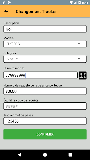 Pour l'enregistrement de votre tracker vous suffit de saisir une brève description, sélectionnez le modèle, la catégorie, le numéro de puce (vous pouvez rechercher directement dans vos contacts) qui est inséré dans le numéro de suivi et le code utilisé pour l'enquête de l'équilibre de votre opérateur et mot de passe.