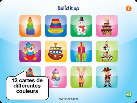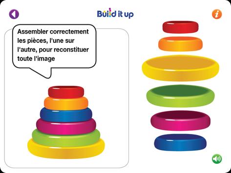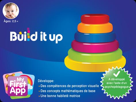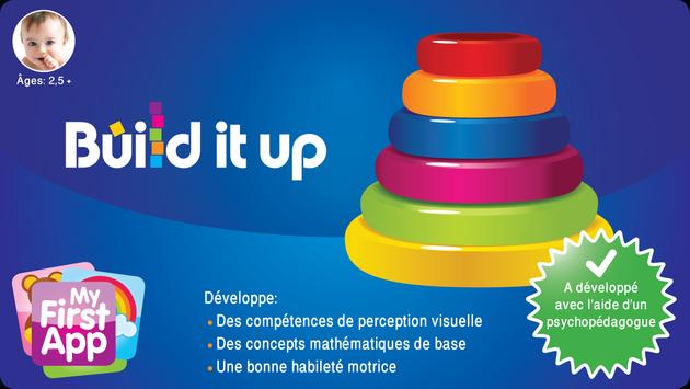 Build it up Aide à développer des aptitudes de perception visuelle et des capacités motrices fines chez les bébés âgés de plus de deux ans et demi. Ce jeu aide aussi à développer des concepts fondamentaux en mathématique tels que la taille, dessus et dessous ainsi qu'avant et après.