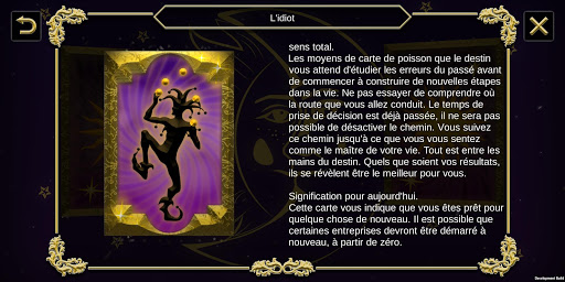 Accédez à l'application et obtenez votre mise en page personnelle. Cliquez sur la carte pour lire sa signification. La révélation de fortune deviendra plus détaillée si vous ouvrez des cartes auxiliaires et obtenez une interprétation avec des combinaisons.