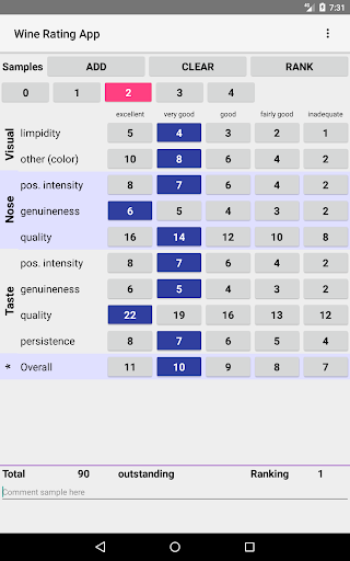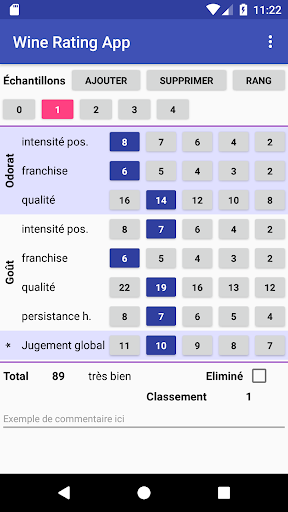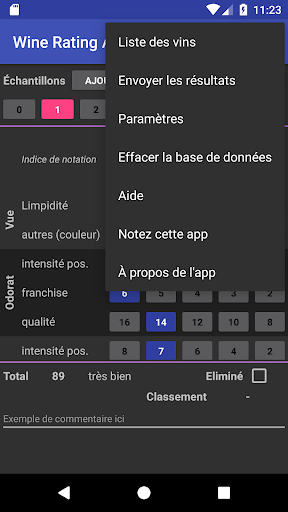 Vous pouvez noter plusieurs échantillons de vin et les classer dans l'application. Les résultats sont stockés dans votre appareil. Vous pouvez envoyer des résultats en pièce jointe dans le fichier .csv (possibilité d'importer sur Excel).
