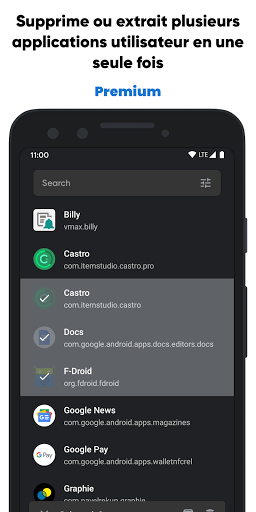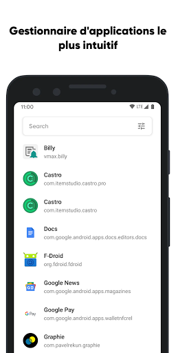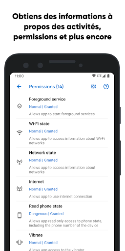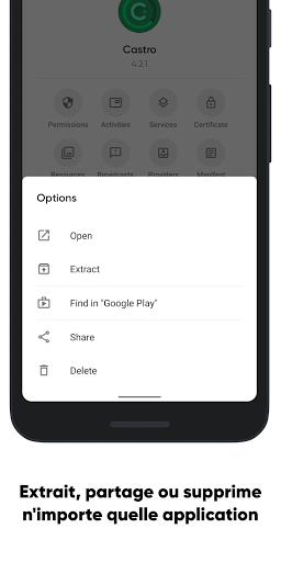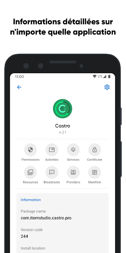 Découvrez le fonctionnement de n'importe quelle application en détail. La liste des activités, des services, des permissions utilisées, et même les détails du certificat de signature de l'application, sont entre vos mains.