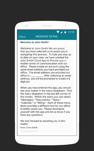 The App is intended to assist clients in communicating with their attorney and staying informed regarding their case.