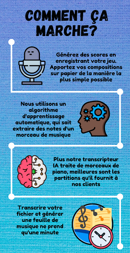 Une fois votre morceau de musique téléchargé, notre transcripteur alimenté par l'intelligence artificielle le traite pour générer une partition basée sur ce qu'elle entend. Lorsque le traitement est terminé, vous obtenez trois sorties: un fichier Midi, une feuille gravée PDF et une feuille de notes numérique MusicXML. Il n'a jamais été aussi simple de convertir des morceaux de piano en partitions!