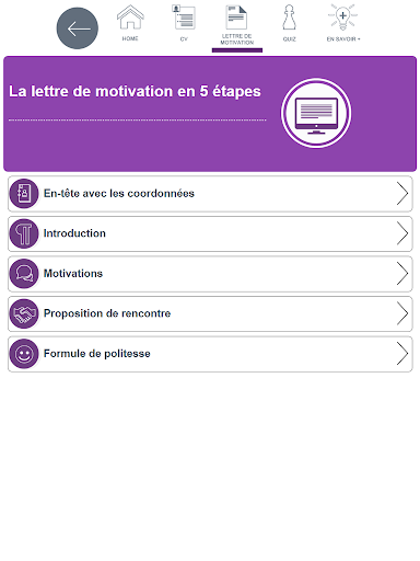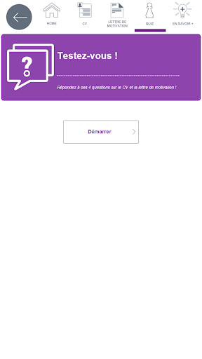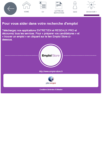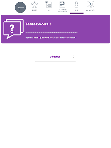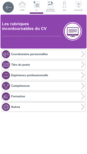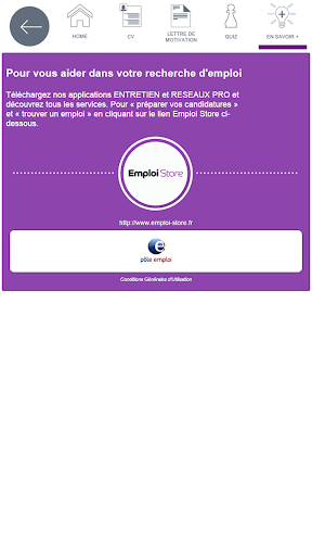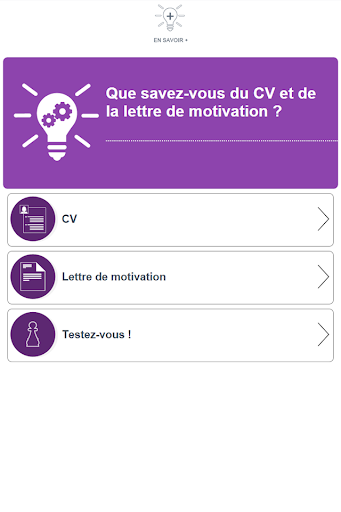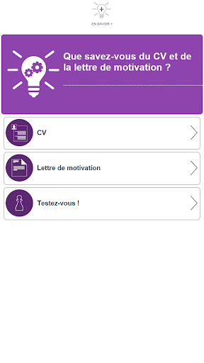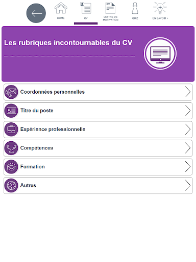 L’application CV LM est un B.A.BA de la recherche d’emploi qui vous permet de voir et revoir les essentiels du CV et de la lettre de candidature. Au travers d’une navigation simple et claire d’une durée d’une vingtaine de minutes vous pourrez également tester vos connaissances sur ces fondamentaux.