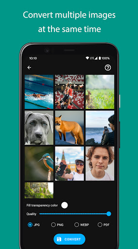 Convertissez plusieurs images en PDF, JPG, PNG et WebP.