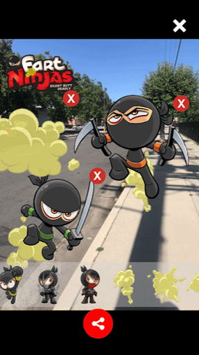 Unleash the Fart Ninjas into the real world and see these mischievous pranksters in action. Using AR you’ll be able to summon Fart Ninjas into any real environment, just make sure you have a flat surface for them to launch on. Fart Ninjas are unpredictable and will randomly perform different actions and attacks so keep a close eye on them. Use the video recording feature to capture the action and save it to watch later or share it with your friends.