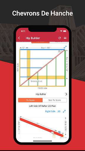 Entrez simplement la pente du toit et la course (longueur inférieure du chevron commun), et l'application générera une image de ce à quoi ressemblera le Hip Rafter, toutes les mesures.
