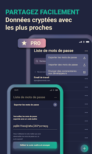 • Exporter & Importer : transférez des fichiers de données cryptés