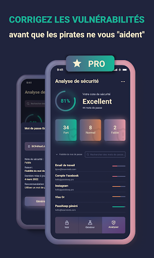 PassKeep garantit que vos données sensibles restent protégées même si quelqu'un accède à votre appareil. Le générateur et l'analyseur de mots de passe vous aident à maintenir les mots de passe les plus forts et les plus sûrs pour tous vos comptes.