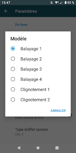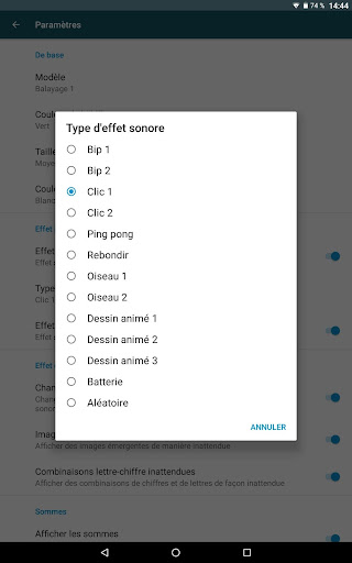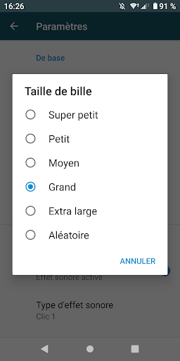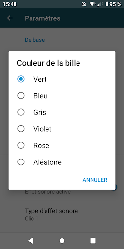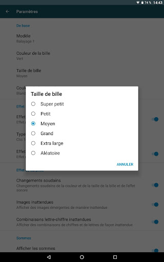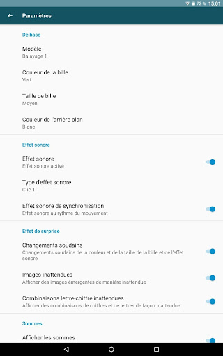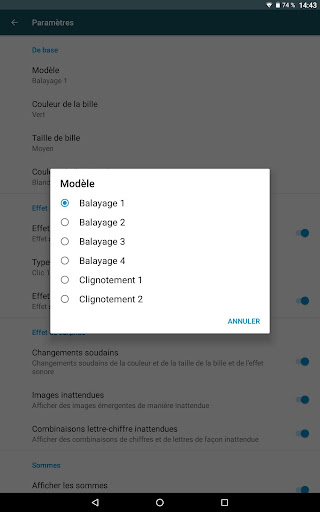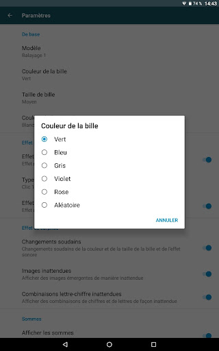 Pour le confort de l'utilisateur, diverses préférences peuvent être définies dans l'application en matière de modèle de mouvement, couleur et taille de la bille, couleur d'arrière-plan et d'effet sonore à reproduire. Il est également possible pour certains paramètres de choisir l'option "aléatoire". Il existe par ailleurs plusieurs paramètres pour les dénommés "effets surprise".