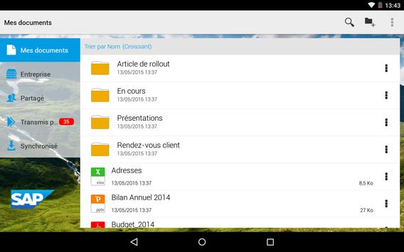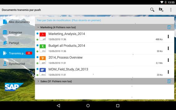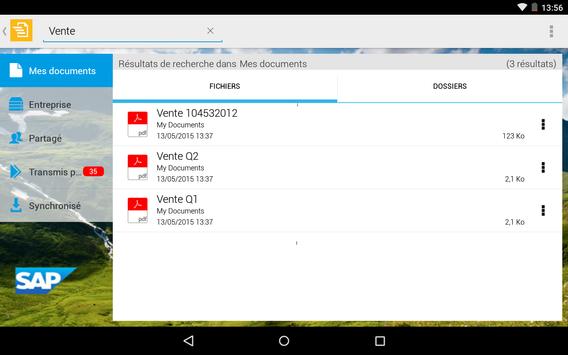 L'application mobile SAP Mobile Documents pour Android vous permet d'emporter en toute sécurité vos documents et contenus personnels et professionnels, où que vous alliez. Contrairement aux transferts de fichiers manuels à l'aide de dossiers partagés ou bien par e-mail, cette application offre un accès rapide et facile à des fichiers se trouvant sur votre ordinateur et dans des systèmes de gestion de documents d'entreprise. Ainsi, vous pouvez y travailler n'importe où et à tout moment.