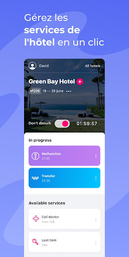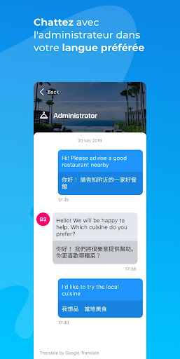 Vous n'avez plus besoin de perdre du temps et s’adresser à la réception, en surmontant des obstacles liés à la langue et s’expliquer avec des gestes. L'application traduira en temps réel tous les messages dans la langue désirée.