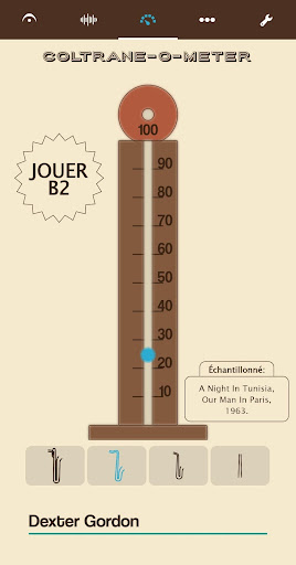 • L'application ne va pas faire le travail à votre place. Si vous cherchez un raccourci magique pour obtenir le son de Dexter Gordon sans travailler une seule minute, Sax-O-Meter ne pourra rien faire pour vous!