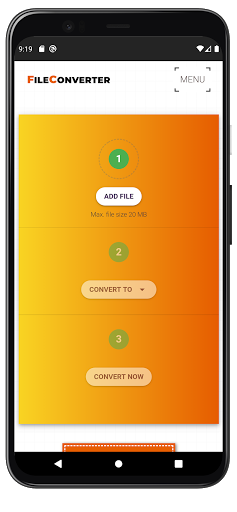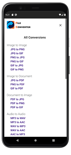 Un convertisseur de fichiers simple et facile à utiliser pour convertir facilement des fichiers et instantanément. Cette application a une interface utilisateur intuitive et simple conçue pour l'utilisateur occasionnel comme vous. C'est une application hors ligne, vous n'avez pas besoin d'une connexion Internet pour convertir vos fichiers.