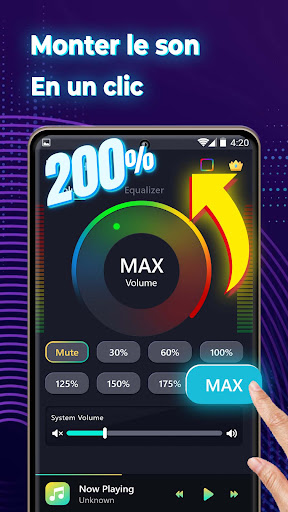 Le son peut être augmenté jusqu'à 200 % à partir de la musique, des haut-parleurs, des enregistrements, de l'audio de la vidéo,... et de tous les sons de votre appareil. Le volume du haut-parleur prend en charge l'augmentation du volume des écouteurs, du Bluetooth et des haut-parleurs.