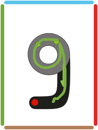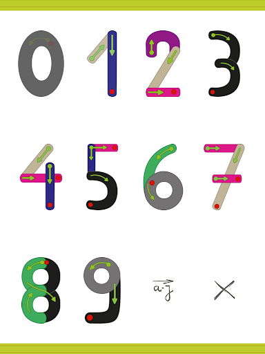 Après avoir appris les tracés fondamentaux, l'enfant apprendra comment écrire chaque chiffre grâce au mode leçon qui lui expliquera quels tracés utiliser (le 1 est un trait couché et un trait debout). Quand l'enfant aura appris un tracé grâce aux chiffres colorés, il pourra s'entrainer avec les chiffres évidés (sans couleurs, feu vert de départ et feu rouge d'arrivé).