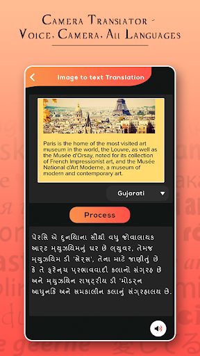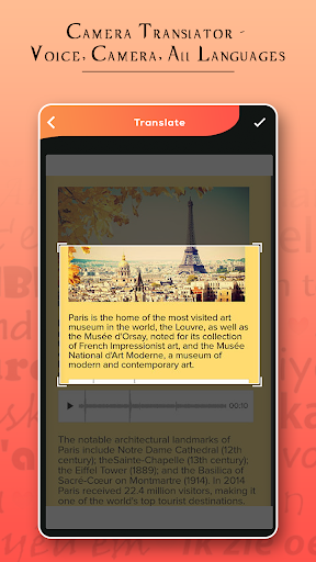 app is the most professional camera translator to translate words with voice or also with a camera. It has no limits and it converts any document, recognition of the camera into text and Uses this cool talking translator to instantly translate any text into different languages! It also pronounces the translation for you and All Language. This application should be helpful for tourists, to traveling any region or country of the world. Application allows users facilities to share, copy text using all messenger app.