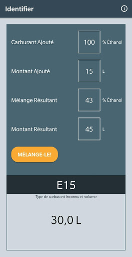 Définit la quantité de deux carburants connus pour obtenir le mélange désiré. Utile lorsqu'un conteneur vide ou un réservoir de carburant doit être rempli avec un mélange d'éthanol.