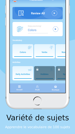Apprenez des mots en thaïe sur plus de 100 sujets différents en utilisant une variété de techniques différentes qui vous aideront à vous souvenir plus facilement. Des jeux de cartes aux exercices d'écoutes ou aux quizz, Vocly vous permet d'apprendre en vous amusant.