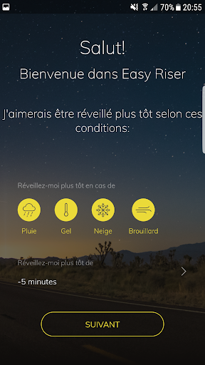 Easy Riser utilise les rapports de trafic et de météo en temps réel pour vous donner JUSTE ASSEZ de temps le matin pour aller où vous devez aller. Si les conditions sont mauvaises, votre alarme vous réveillera plus tôt. Si les conditions sont bonnes, votre alarme vous laissera dormir.