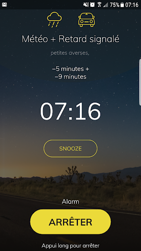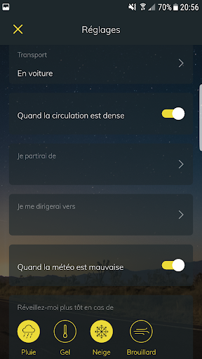 Notre application utilise des rapports météorologiques en temps réel pour détecter si votre trajet sera affecté par la pluie, la neige, le brouillard ou le gel. Dites-nous combien de temps de plus vous avez besoin dans ces conditions, et nous déclencherons votre alarme plus tôt si ces conditions se présentent.