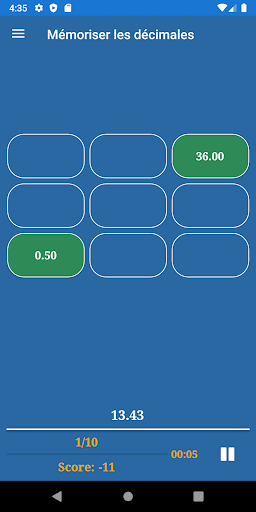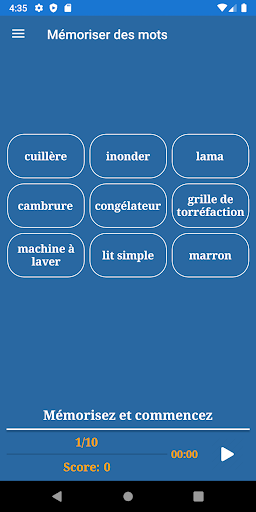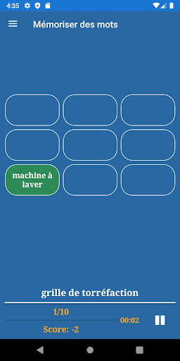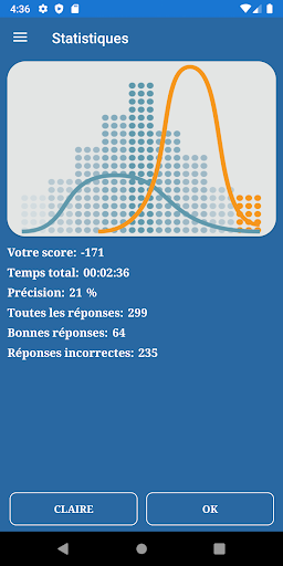 Vous pouvez voir les statistiques en choisissant l'élément de menu dans le menu principal. Les informations comprennent le score global, le temps global, la précision, le nombre de réponses correctes et incorrectes.