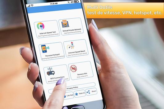 Test de vitesse Internet - VPN WiFi Booster Hotspot est une application de sécurité et de confidentialité Internet rapide et gratuite. Free Android illimité fonctionne comme un serveur proxy pour Android. Vous disposez maintenant d'une application multifonctionnelle dans laquelle vous pouvez l'utiliser comme testeur de vitesse Wi-Fi et puissance du signal, comme indicateur de performance mobile ainsi que comme VPN maître proxy. Maintenant, vous pouvez contourner les restrictions du réseau wifi scolaire dans Internet Speed Test - Point d'accès VPN WiFi Booster. Contournement des restrictions d'emplacement, des filtres Internet et de la censure à très grande vitesse. Peu importe si vous recherchez une meilleure sécurité sur un point d'accès WiFi public ou un service vpn rapide pour vos programmes préférés, vous pouvez obtenir tout cela avec un vpn gratuit pour Android. Accès au service proxy illimité avec vpn free android illimité et hotspot VPN gratuit. Test de vitesse Internet - VPN WiFi Booster Hotspot est un navigateur proxy pour le travail gratuit sous Android en tant que service Internet domestique sécurisé. Le navigateur proxy pour Android aide à libérer votre espace de stockage en supprimant les fichiers inutiles, les fichiers résiduels et les fichiers en cache, ce qui ralentit votre téléphone. Free VPN pour Android peut également aider à voir toutes les connexions près de chez vous. Ce sera plus utile comme une application de test de vitesse. Vous pouvez vérifier la vitesse de téléchargement / téléchargement de votre navigateur Internet. C'est un logiciel VPN qui en fait le membre de la famille sécurisée. vpn app unblocker et contourner tous les sites proxy et travailler en tant que serveur proxy pour Android. Test de vitesse Internet - VPN WiFi Booster Hotspot peut prolonger la durée de vie de la batterie en fermant les applications qui la déchargent. Nettoyez et améliorez votre téléphone avec System Clean & Cache Clean, pour prolonger la vie de votre batterie. Vous pouvez facilement rechercher les connexions wifi et vous pouvez également utiliser comme point d'accès personnel. Clean Master a ajouté la fonction de sécurité WiFi afin de détecter les faux accès Wi-Fi et les connexions non autorisées. Protégez votre téléphone des accès WiFi publics non sécurisés. Vpn app fournit un réseau mondial de serveurs vpn (Norvège, Russie, Inde, Japon, Danemark, Maxico, Italie, France, Ukraine, Espagne, Brésil, Suède, Singapour, Australie, Royaume-Uni, Irlande, République tchèque, Canada, Nouvelle Zélande, Turquie et États Unis).