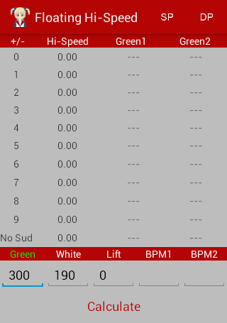 Floating hi-speed uses the input green number, white number, lift (if any) and 2 BPM. It will show the user the green number corresponding to the hi-speed changes by pressing the white/blue keys in game. While using this the white number will be kept constant, and the first input BPM will be used to determine the Hi-speed.