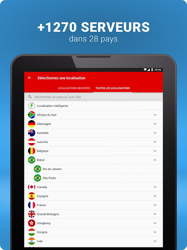 Découvrez Smart Connect: Cette fonctionnalité vous connecte automatiquement à la meilleure option de serveur disponible en quelques secondes. Vous recherchez un emplacement précis? Profitez de notre vaste réseau de serveurs avec plus de 1270 serveurs dans 28 pays partout dans le monde.