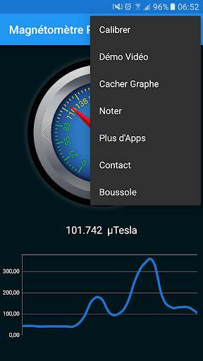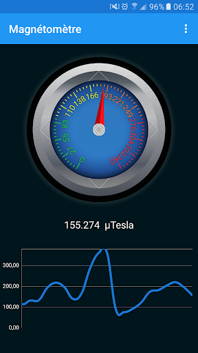 Une Jauge vous aide à voir la valeur magnétique qui est également affichée de manière textuelle. La valeur magnétique est présentée en µT (Microtesla). Un graphe vous montre également l'activité magnétique récente.