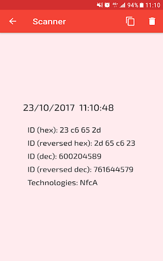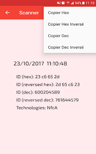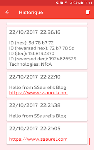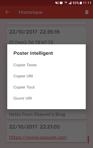 Pour utiliser Lecteur NFC, vous avez juste à maintenir un tag ou une carte à l'arrière de votre appareil pour le lire. Lecteur NFC vous permet de copier le contenu du tag (id, hexadécimal, texte ou URI) ou d'ouvrir l'URI. Vous pouvez également gérer tous les tags et cartes précédemment scannés dans la partie Historique.