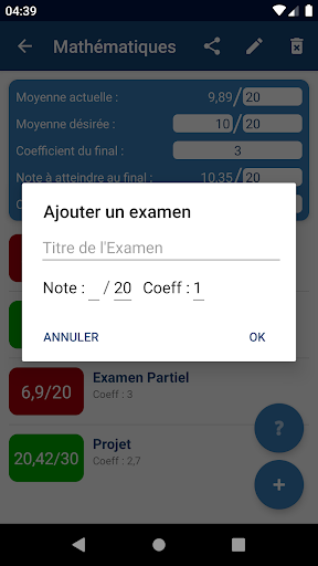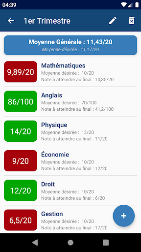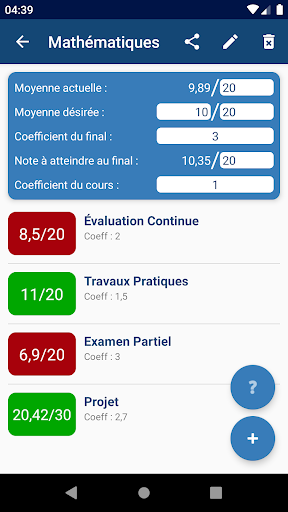 Renseignez simplement la moyenne désirée ainsi que les notes déjà obtenues et les coefficients correspondants, et l'application vous calcule votre moyenne dans chaque cours, votre moyenne générale et la note de passage à atteindre à l'examen final.