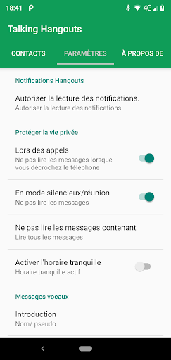 Téléchargez cette application gratuite pour écouter les messages de messagerie de chat de Google Hangouts. Parfait comme lecteur de chat de hangouts en mode conduite mains libres, pas besoin d'atteindre ou de voir votre téléphone, écoutez simplement la voix de vos messages de hangouts.