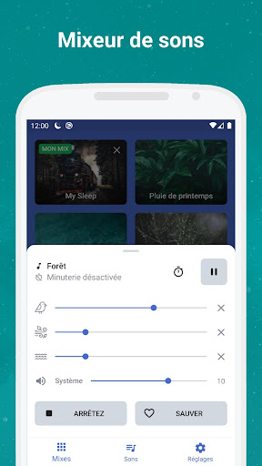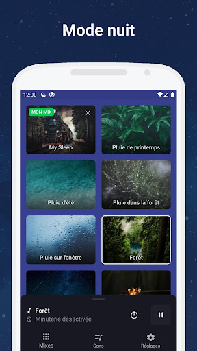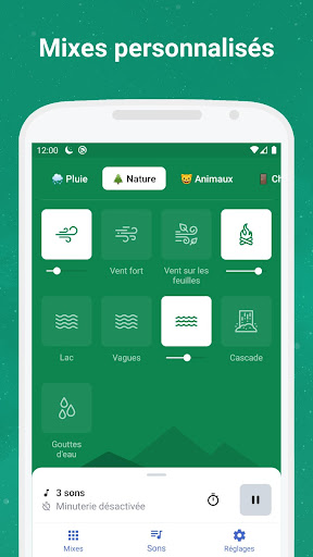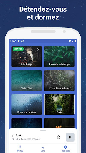 Essayez d'être surpris de la facilité d'endormissement avec des sons apaisants pour dormir. Choisissez et combinez vos propres mixages sonores pour soulager le stress ou augmenter la concentration. Réglez une minuterie et ne vous inquiétez pas de la batterie du téléphone, la minuterie éteindra les sons en douceur.