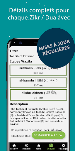 (تسبیحةالزھراء / فاطمہ الزھرا). Pour chaque étape (dhikr) d'une wazifa (séquence de dhikr), il montre du texte à réciter et des répétitions pour simplifier les séquences de dhikr complexes.