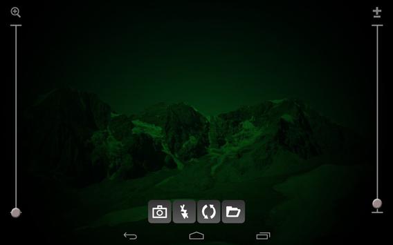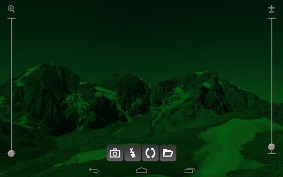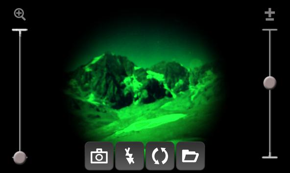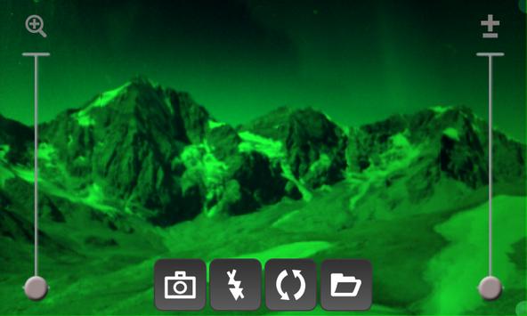 NightVision Camera simulates a live night vision camera effect using image processing to increase contrast in dark regions. Two modes are provided: a fullscreen, and a viewfinder mode.