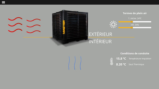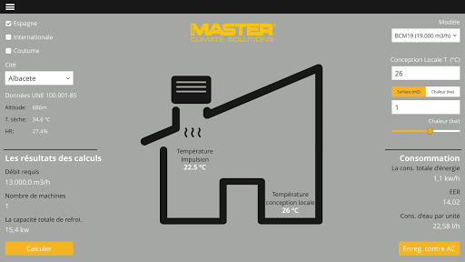 L'application de refroidissement par évaporation Master Coolers permet des simulations et des calculs réels pour des projets de climatisation. Outil avec lequel nous pouvons connaître les immenses possibilités d'économie d'énergie et les avantages que ce type de systèmes apporte.