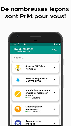Questions sur tous les sujets de l'application. Les jeux-questionnaires vous aideront à apprendre la physique tout en vous amusant.