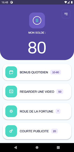 Regarder des vidéos, des publicités et jouez à la roue pour gagner des pièces que vous pourrez ensuite échanger contre de l'argent réel.