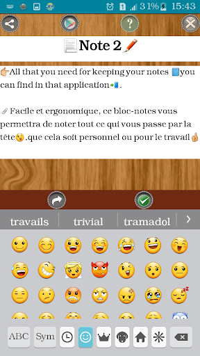 uses the android sharing system, allowing you to share any note with anyone, at any time. Wherever it's via a social networking site like Facebook or Twitter, Whatsapp, as long as you have the app on your device, you can share a note with it!