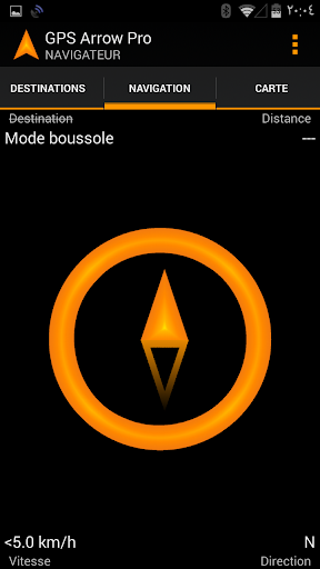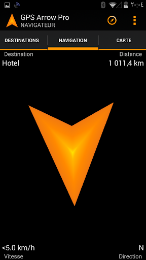 GPS Arrow Navigator vous montre la direction dans laquelle vous devez aller, ainsi que vos position et vitesse actuelles et la distance entre vous et la destination sélectionnée.