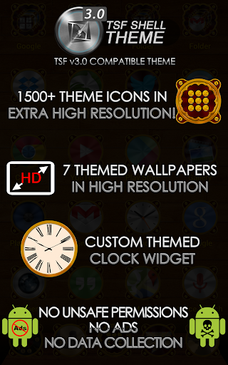 Thème de lanceur TSF compatible avec la dernière version du shell TSF. Thème extrêmement détaillé et de haute qualité TSF, élégant et moderne Shell avec des graphiques haute définition, comprenant un 1500 paquet d'icônes HD, 7 fonds d'écran HD sur le thème sur mesure et un widget d'horloge à thème, afin de donner des graphiques très détaillés et définis, même dans des appareils avec les écrans de résolution la plus détaillée. . Tout est thématique au dernier détail, à l'aide de textures métalliques, d'effets d'éclairage, de réflexions et de gradients pour donner un excellent aspect de contraste et de qualité.