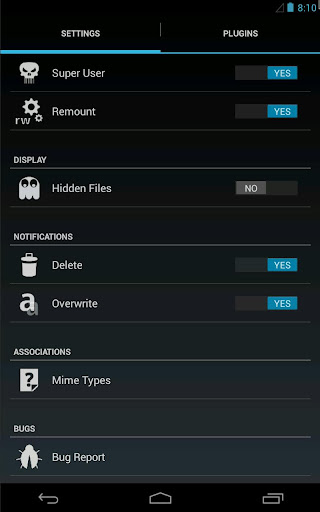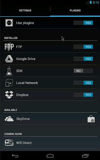 L'accès aux fichiers distants se fait par l'intermédiaire de plugins, afin de garder l'application principale simple et laisser les utilisateurs decider quelles fonctionnalités ils désirent installer. Les plugins disponibles sont listés dans les paramètres.